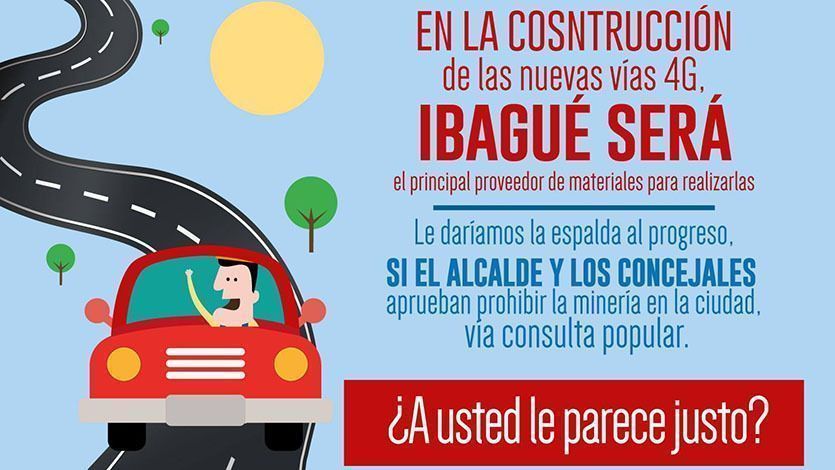 Una de las últimas publicaciones hechas por dicho perfil señalan que Ibagué podría ser un punto clave para la construcción de las llamadas vías 4G, las cuales hacen parte de los proyectos de ‘interés nacional’ (Pines) promovidos por el Gobierno Nacional: «En la construcción de las nuevas vías 4G, Ibagué será el principal proveedor de materiales para realizarlas. Le daríamos la espalda al congreso si el Alcalde y los concejales aprueban prohibir la minería en la ciudad, vía consulta popular», indica la publicación.