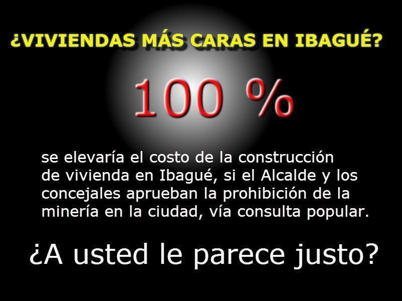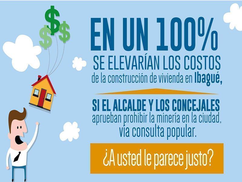 Una de las imágenes publicadas por el perfil señala de manera ligera que los costos de la vivienda en Ibagué se aumentarían en un 100 % si se realiza la consulta popular minera, pero no da ninguna explicación acerca de cómo se relacionan los proyectos de vivienda con una iniciativa popular que va en contra de los intereses de las empresas mineras: «¿Viviendas más caras en Ibagué? 100 % se elevaría el costo de la construcción de vivienda en Ibagué, si el Alcalde y los concejales aprueban la prohibición de la minería en la ciudad, vía consulta popular», señala una de las imágenes.